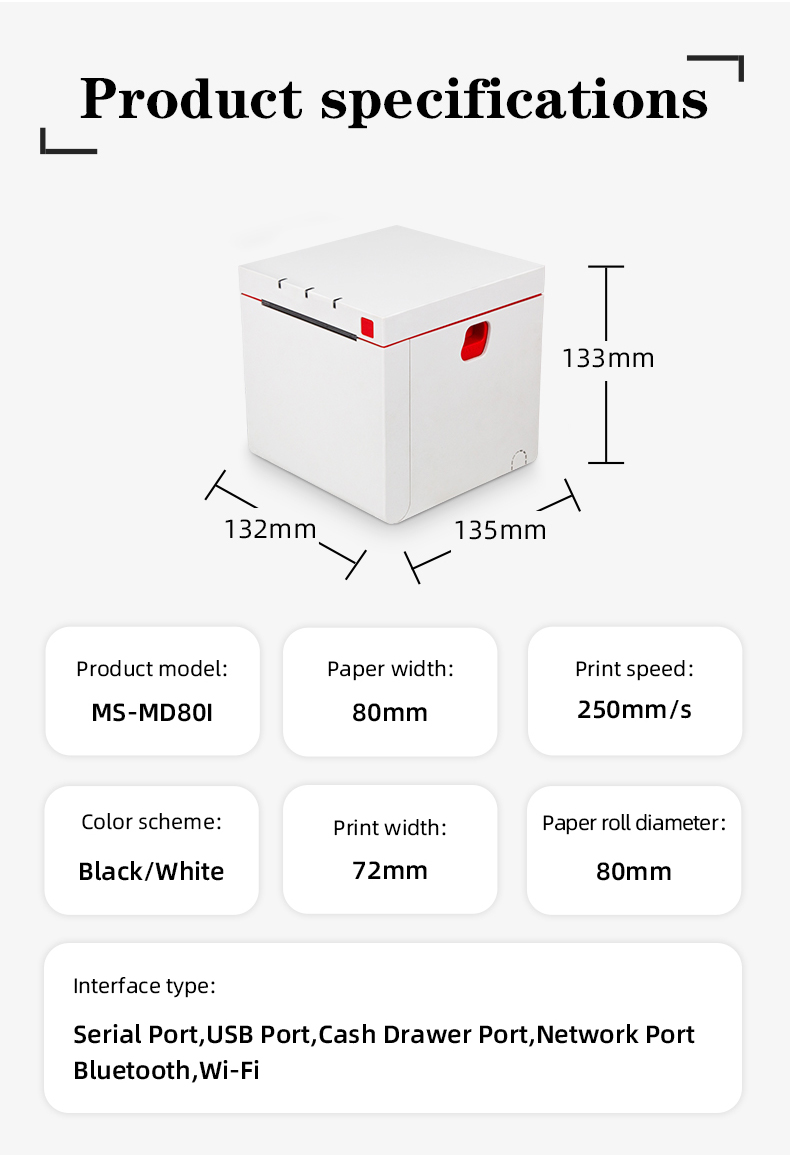 The MS-CH80I is an ultra-high-speed 80 mm thermal receipt printer engineered for demanding business environments. Combining a rapid 250 mm/s print speed with a reliable printer thermal 80mm auto cutter, it delivers unparalleled efficiency. Its versatile connectivity and robust design make it the perfect 80 mm portable thermal printer for retail, hospitality, and restaurants with takeout or online delivery service, ensuring seamless and durable performance.