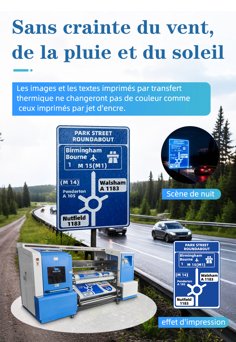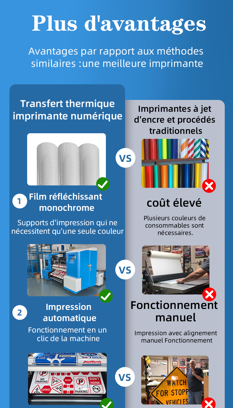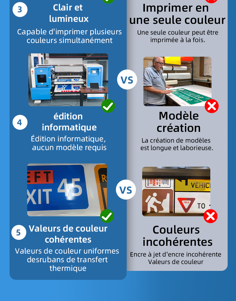 • Économies importantes sur les matériaux : Notre technologie avancée d’impression pour panneaux de signalisation optimise l’utilisation des matériaux. Elle réduit la consommation de film réfléchissant de 1,6 fois (1,0 sur le dessus, 0,6 au verso) à seulement 1,0 fois, soit une réduction de 37,5 % des coûts de film.