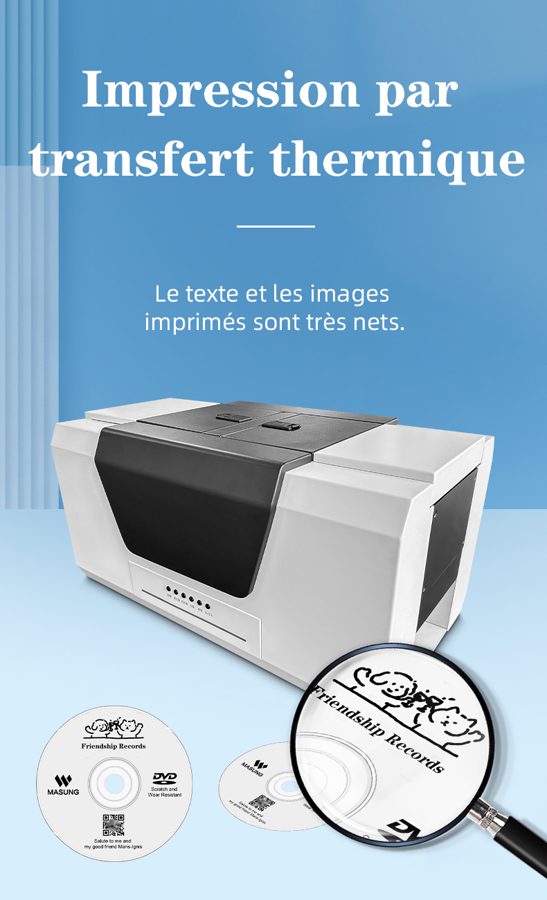 Ce système est doté d’une technologie avancée d’impression par transfert thermique, une alternative supérieure aux imprimantes à jet d’encre standard pour CD. En tant qu’imprimante dédiée pour CD et DVD, elle produit des impressions résistantes aux traces de doigts et relativement aux rayures en seulement 5 secondes par disque. Testée pendant 10 jours consécutifs, les têtes d’impression ne se bouchent jamais, éliminant la maintenance et empêchant la contamination, ce qui garantit une impression fiable et de haute qualité à un coût par disque très bas.