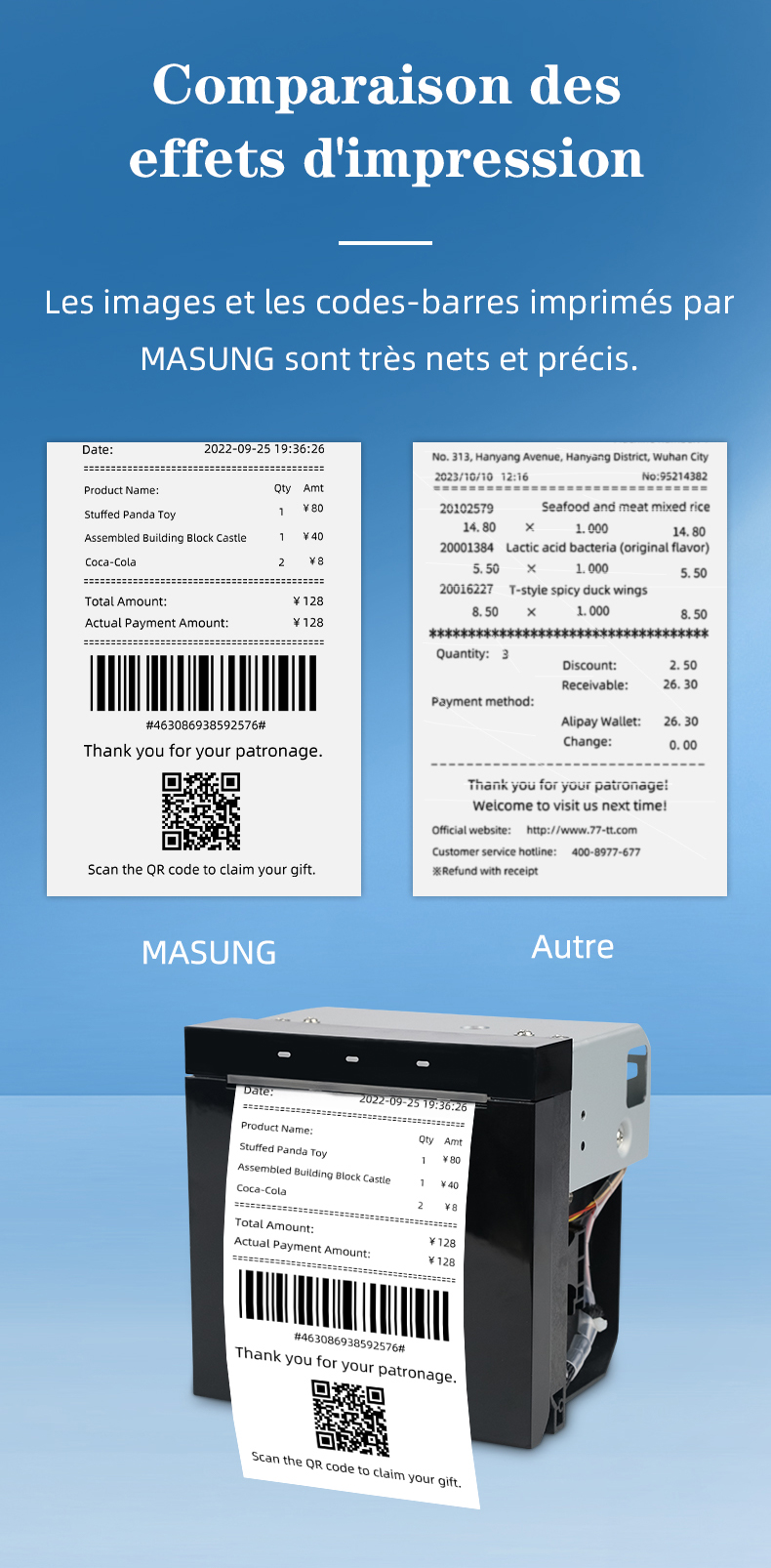 L’imprimante thermique MASUNG MS-FPT305 est un module haute performance conçu pour une intégration simple et polyvalente. Son format compact et sa compatibilité avec des largeurs de papier ajustables de 58 mm et 80 mm en font une solution idéale pour les environnements à espace restreint.